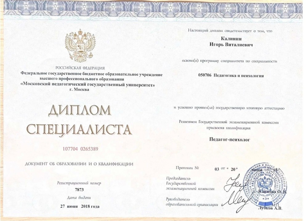 - «Московский Педагогический Государственный Университет» Педагог-психолог.